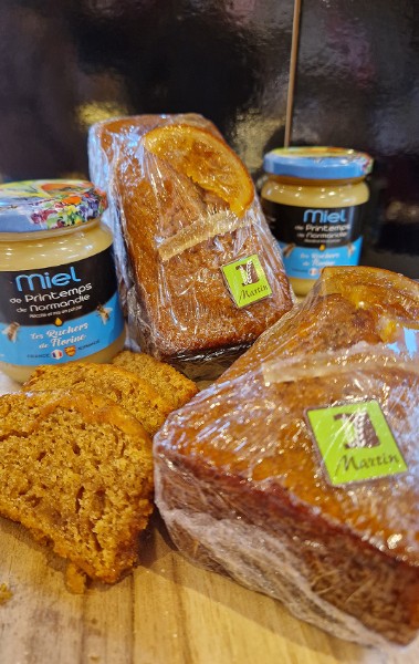 ce pain d'épices, fait MAISON avec des ingrédient locaux, marque de fabrique de la boulangerie Martin,un mélange de farine de seigle de la FERME DES NOYER, de la farine de tradition "PAIN NORMAND", du miel des RUCHERS DE FLORINE, du lait BIO de LA FERME DE LA MARE BLONDE? et des œufs de LA FERME FONTAINE, un mélange de 7 épices différentes donne à ce pain d'épices un parfum équilibré.